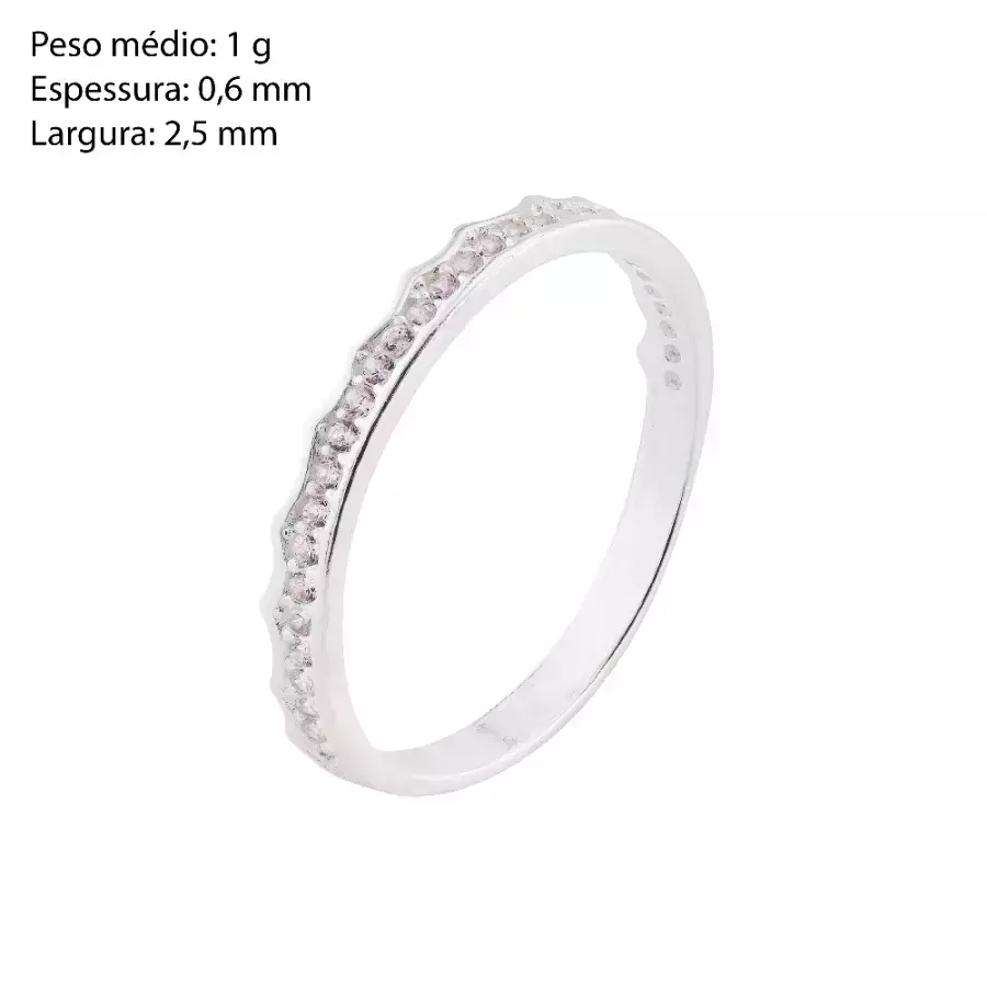 O Anel Prata Coroa com Zircônias possui um design sofisticado que remete a uma coroa, trazendo um toque romântico e elegante para o seu visual. As zircônias cuidadosamente cravejadas proporcionam um brilho especial que destaca ainda mais a peça.